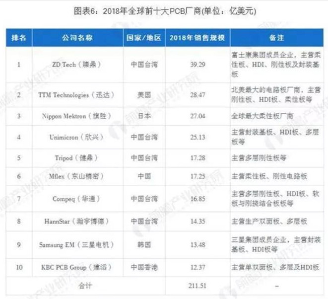 全球印刷電路板行業(yè)集中度不高,生產(chǎn)商眾多,市場競爭充分。雖然目前PCB行業(yè)存在向優(yōu)勢企業(yè)集中的發(fā)展趨勢,但在未來較長時(shí)期內(nèi)仍將保持較為分散的行業(yè)競爭格局。根據(jù)N.T.Information發(fā)布的2018年世界百強(qiáng)PCB企業(yè)排行榜,2018年前十大PCB廠商收入合計(jì)為211.51億美元。2018年全球前十大PCB廠商的銷售情況如下: