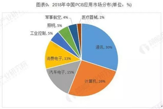 電子信息產(chǎn)業(yè)的蓬勃發(fā)展是PCB行業(yè)發(fā)展的重要助力。從下游應(yīng)用領(lǐng)域分布來看,2018年通訊行業(yè)的PCB市場規(guī)模最大,占比約為33.4%;其次是計(jì)算機(jī)行業(yè),占比約為29.4%。其他領(lǐng)域PCB市場規(guī)模較大的是消費(fèi)電子、汽車電子。
