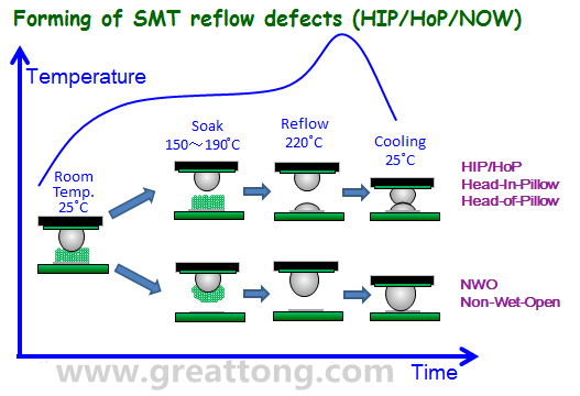 上圖將NWO(Non-Wet-Open)與HIP(Head-In-Pillow)或HoP(Head-of-Pillow)在SMT的Reflow溫度曲線下形成的原因稍微做了解釋,基本上兩者都是因為板材變形所致,只是HIP的錫膏會保留在電路板的焊墊上,但NWO則完全轉(zhuǎn)移到了錫球。
